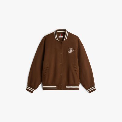 With its stripe rib-knit trims and pared-back chest branding, this double-faced wool-blend bomber jacket has an authentic varsity vibe.