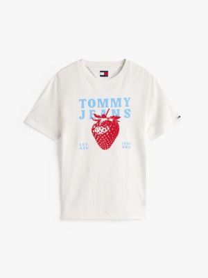 Add a fruity edge to your wardrobe with this pure cotton T-shirt, featuring a bold strawberry graphic on the chest.