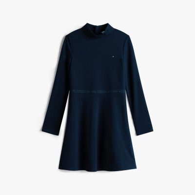 This long-sleeve skater dress combines an elegant relaxed mock neck with a sparkly repeat logo waistband, creating a stylish and eye-catching look.