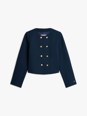 This collarless double-breasted jacket, crafted from a textured wool-blend weave, is embellished with contrasting branded buttons for a timeless look.